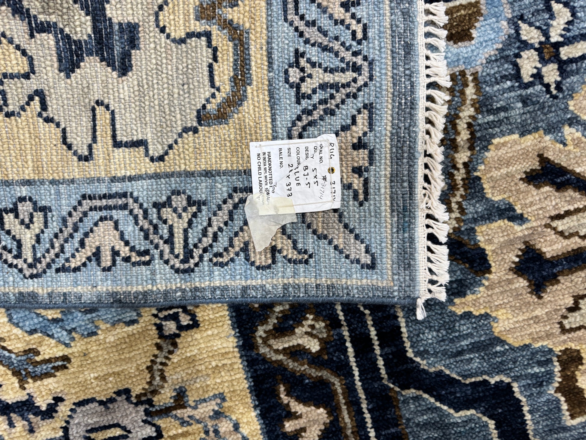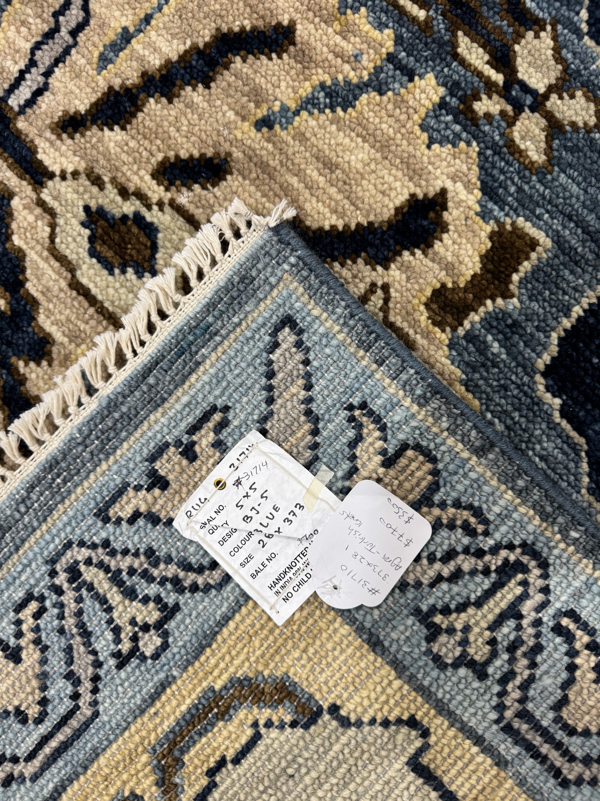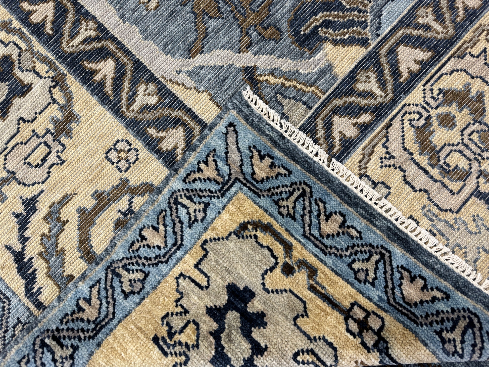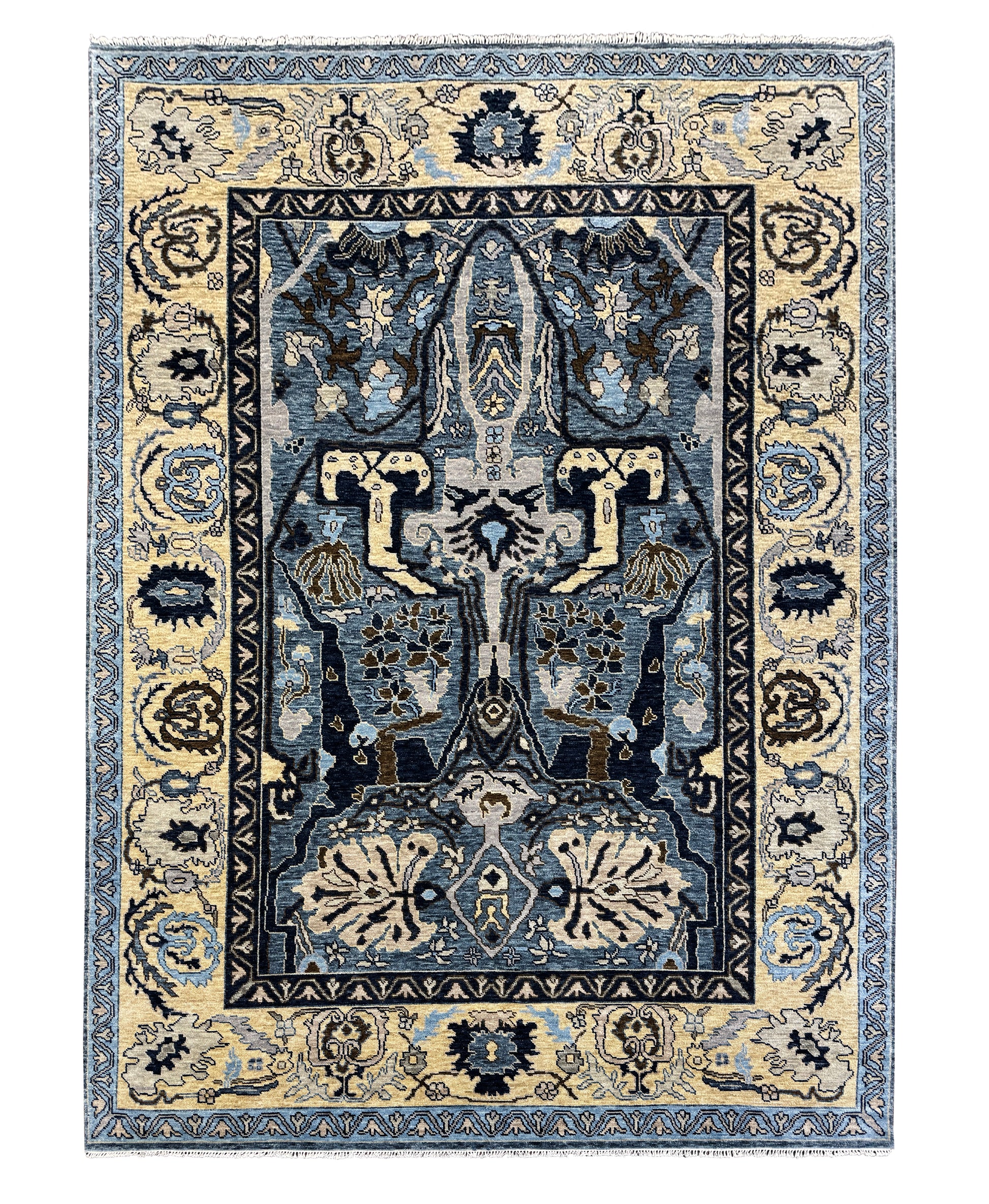 This hand-knotted Agra rug is inspired by the 16th-century Garous design, a celebrated Persian pattern known for its bold medallions and fluid vine work. Woven with handspun New Zealand wool, it combines luxurious softness with lasting durability. The deep blue ground enhances its intricate motifs, giving the piece both depth and vibrancy. A fine blend of Mughal-era weaving tradition and Persian artistry, this rug carries a timeless elegance