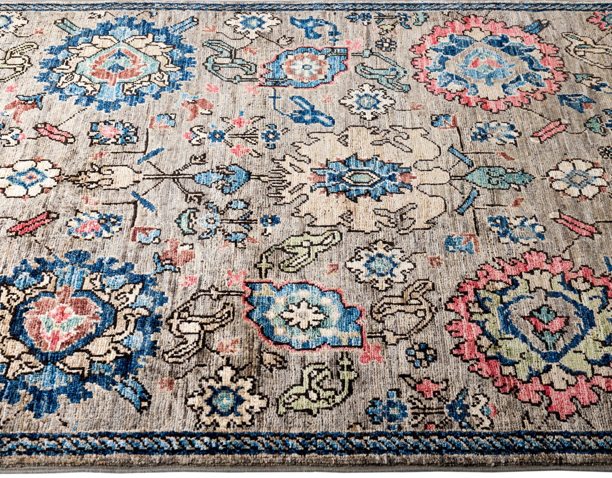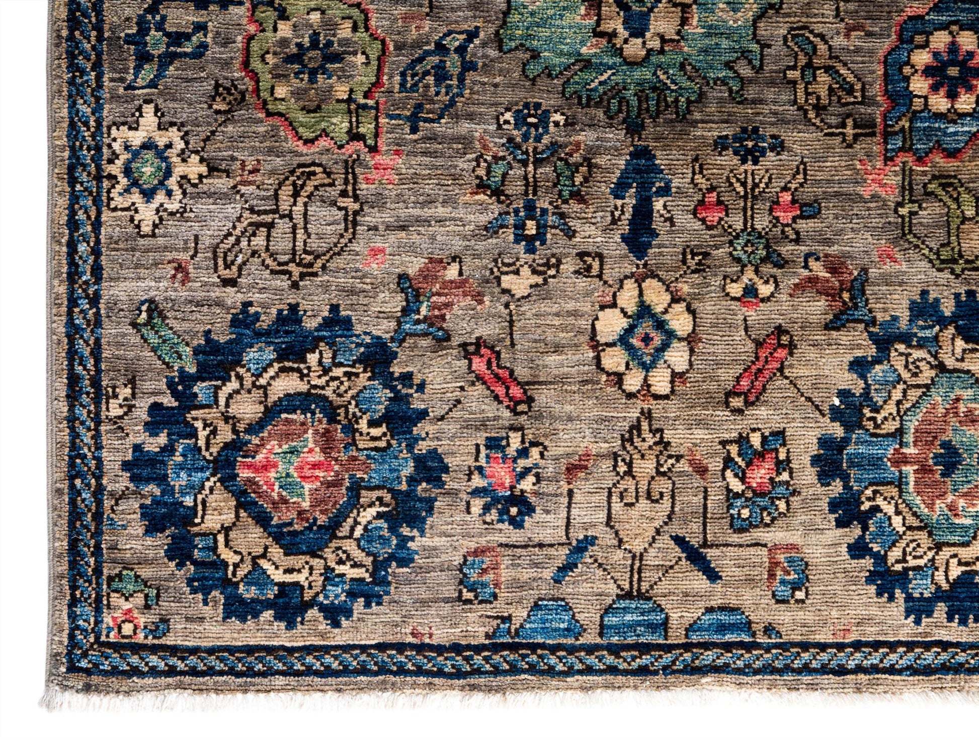 This custom-made Afghan Turkaman runner (583x90 cm) features a 16th-century Safavid floral design, seamlessly transitioned with modern colours to create a unique bohemian look. Handwoven by Turkaman artisans in Mazar-Sharif using handspun wool and dyed with natural vegetable colours, this piece combines traditional Safavid motifs with a contemporary bohemian palette. Perfect for adding an eclectic yet sophisticated touch to any space.