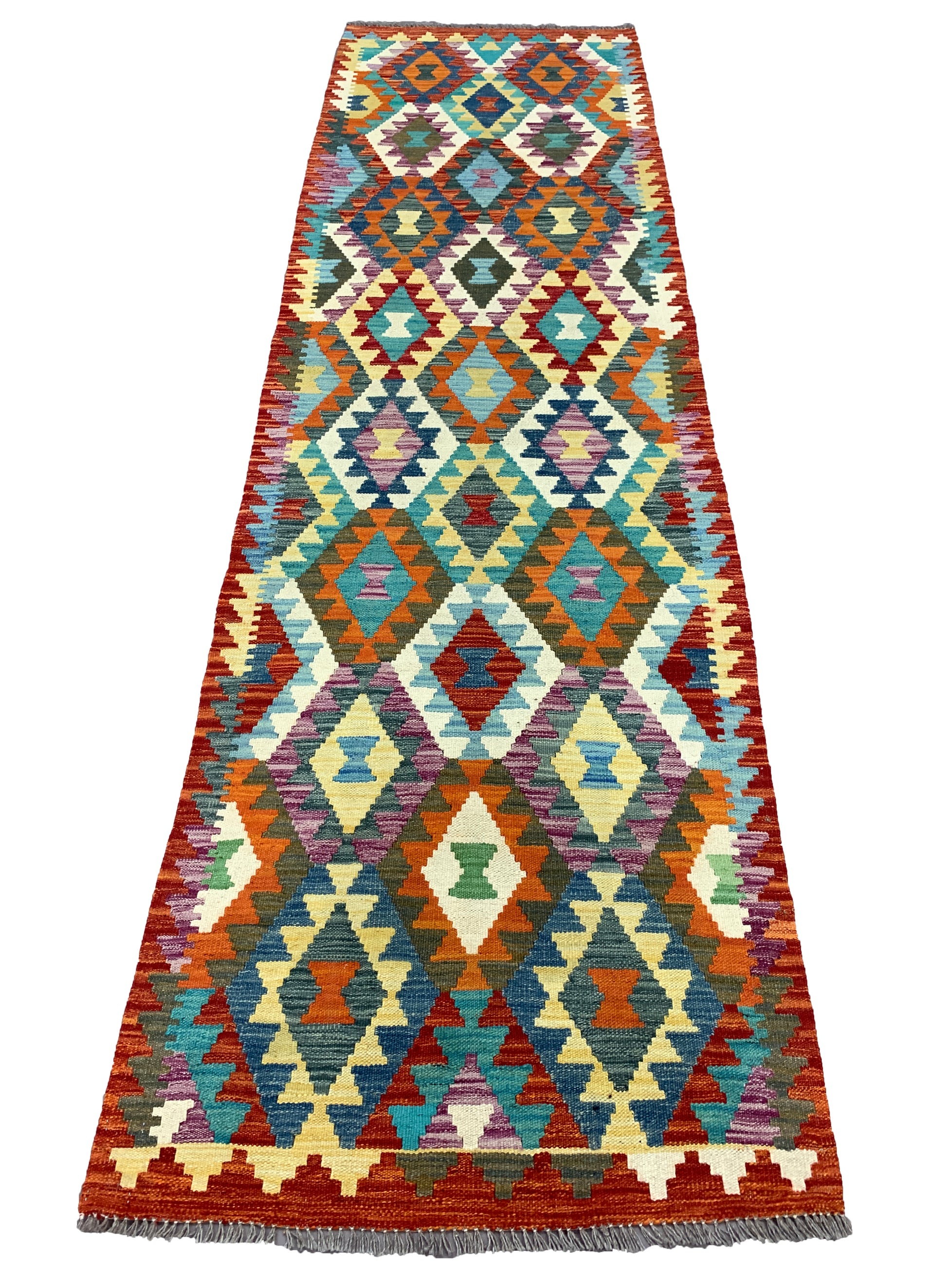 A beautifully handwoven Maimaneh kilim from Afghanistan, showcasing the classic geometric patterning and balanced colour palette characteristic of this traditional flatweave style. Made with hand-spun wool and crafted using time-honoured weaving techniques, it offers durability along with an authentic tribal aesthetic. Compact and versatile, this piece makes an excellent accent rug, adding warmth, texture, and artisanal charm to any setting.