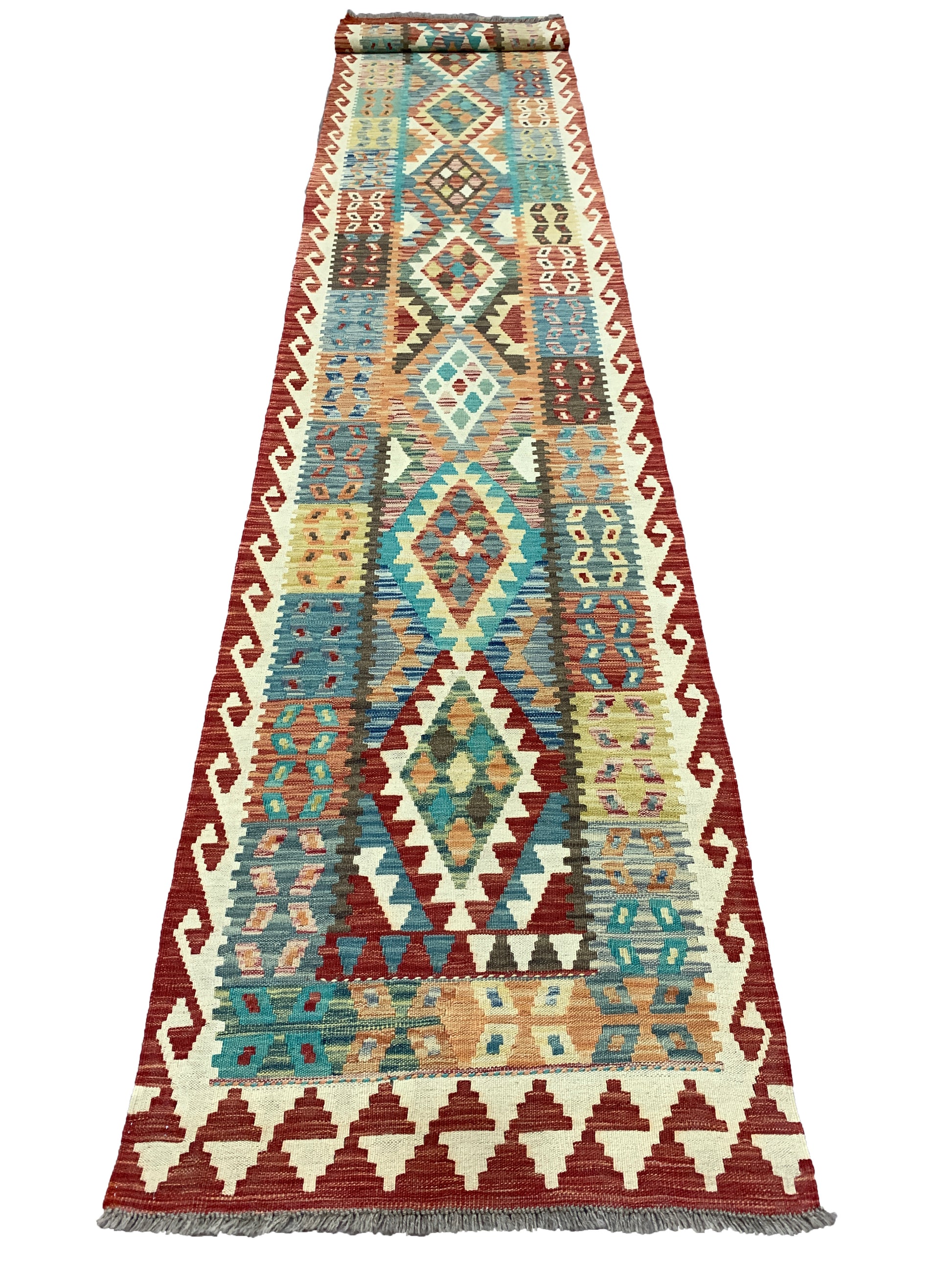 A beautifully handwoven vegetable-dye kilim runner from Afghanistan, featuring traditional geometric motifs rendered in a naturally dyed, earthy palette. Its long, narrow format makes it ideal for hallways or transitional spaces, while the tight flatweave construction ensures durability and a pleasing, tactile finish. Authentic and versatile, this piece showcases the timeless artistry of Afghan weaving traditions.