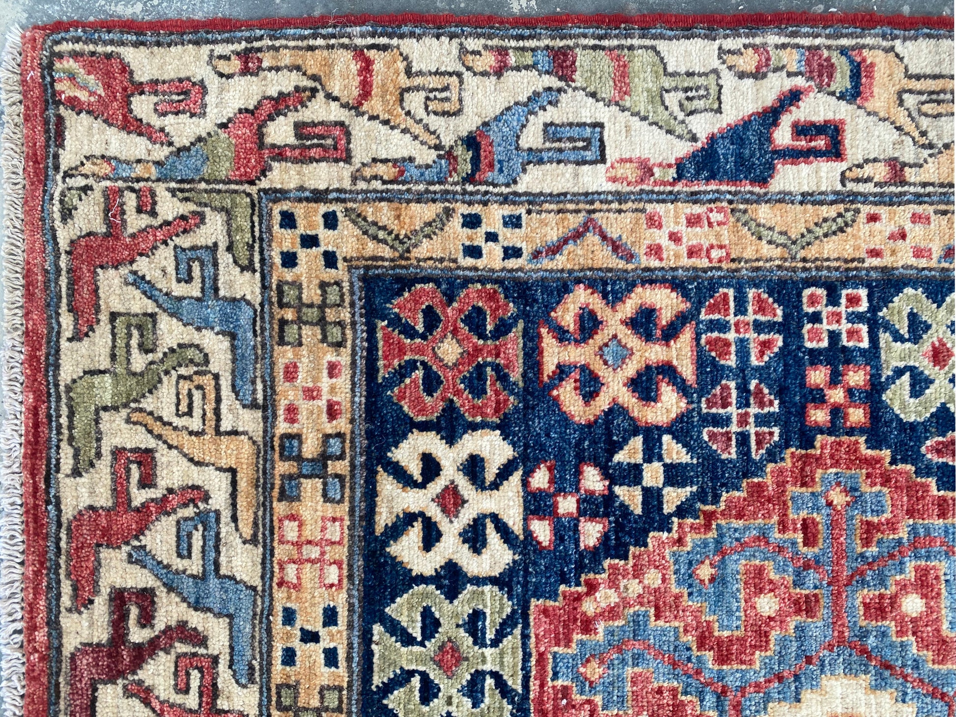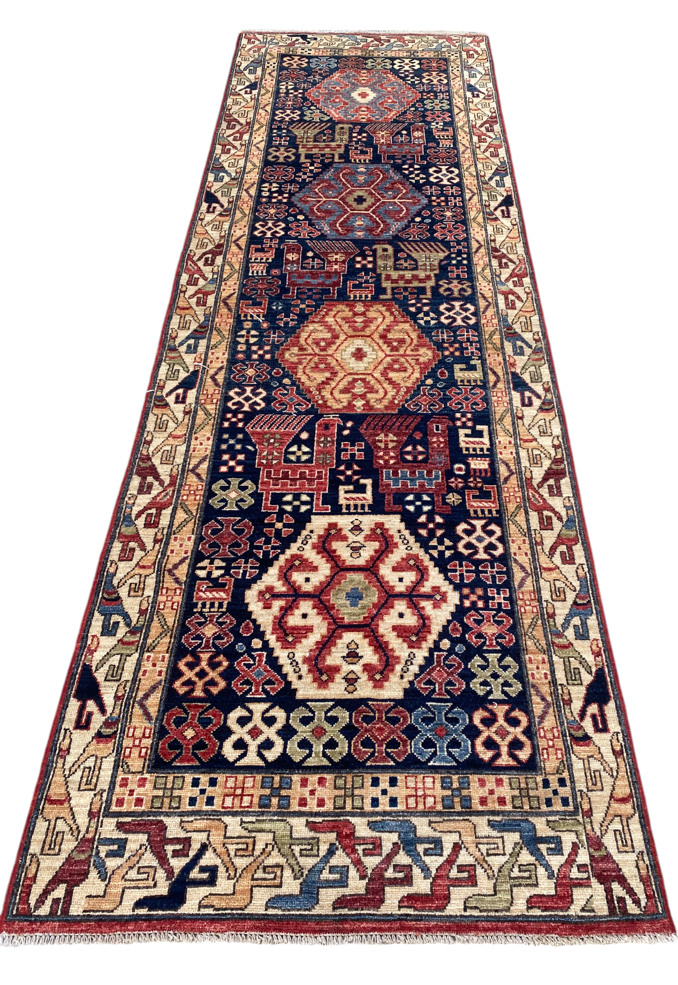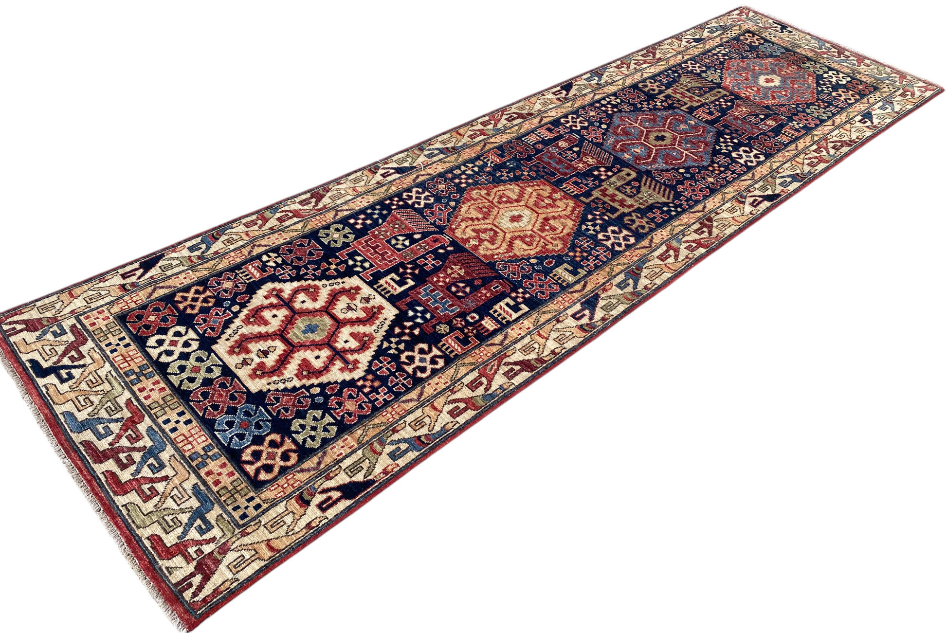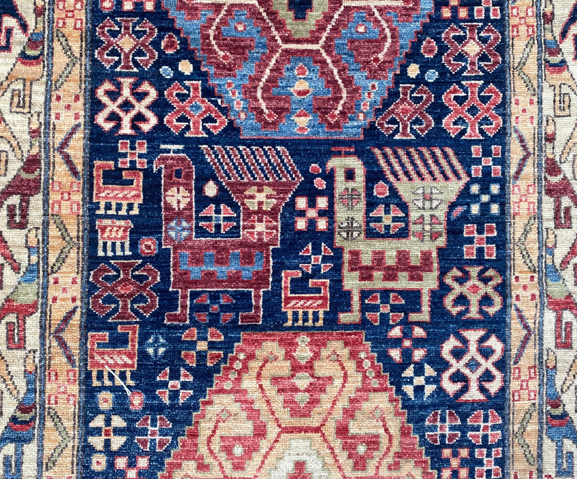 This Afghan Turkaman rug features a 18th-century Caucasian design, handwoven in a specialised studio in Mazarsharif, Afghanistan, handspun wool and natural vegetable dyes