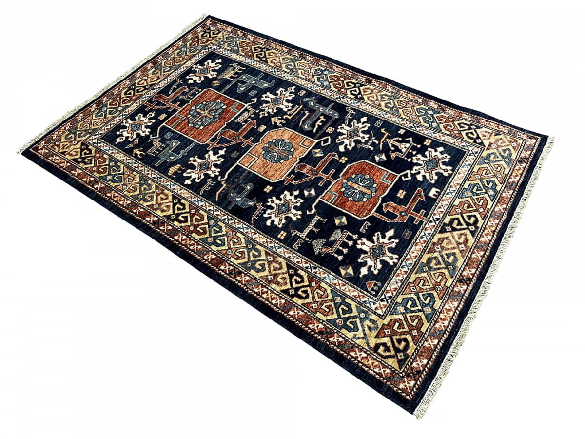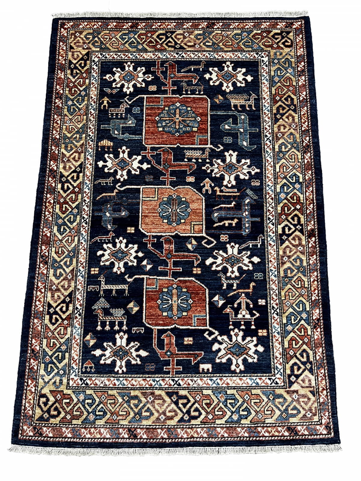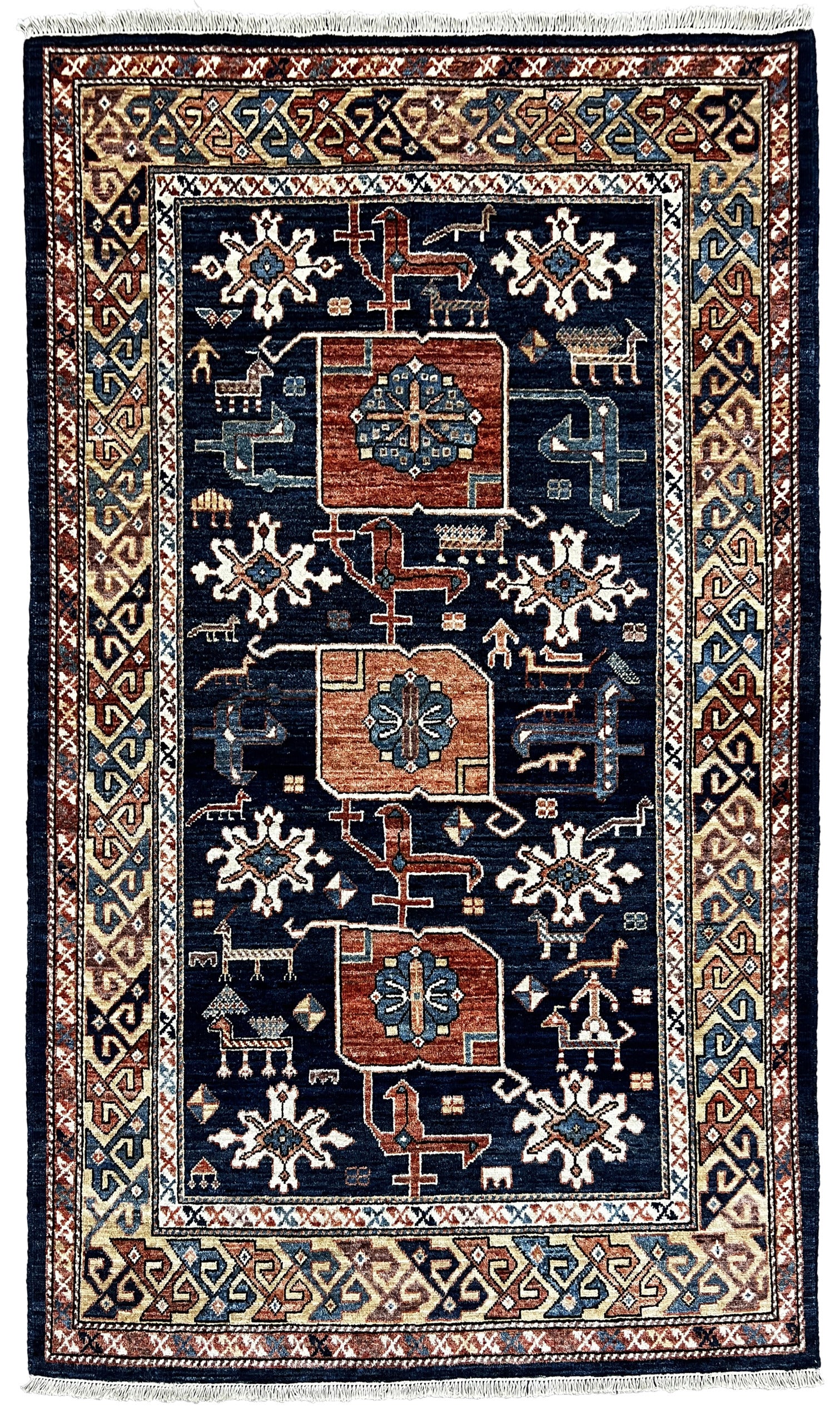 Custom-made Afghan carpet, woven by Uzbek artisans using a 19th-century Caucasian Kazak design. Crafted with handspun wool and natural vegetable dyes,