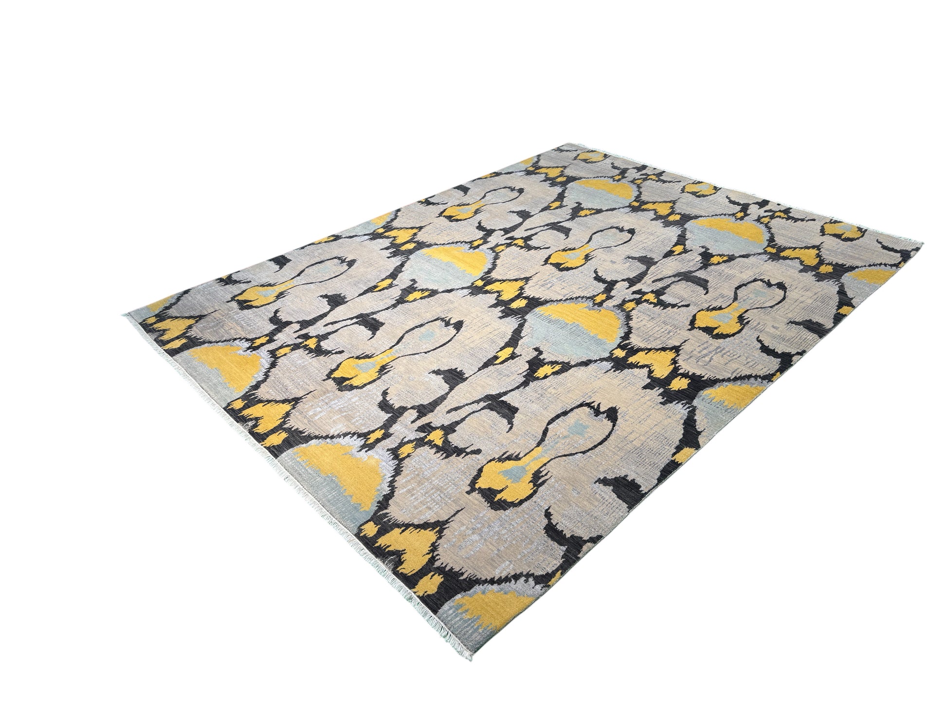 Custom made designer Agra carpet, Central Asia Ikat design, hand spun bamboo silk pile, India,