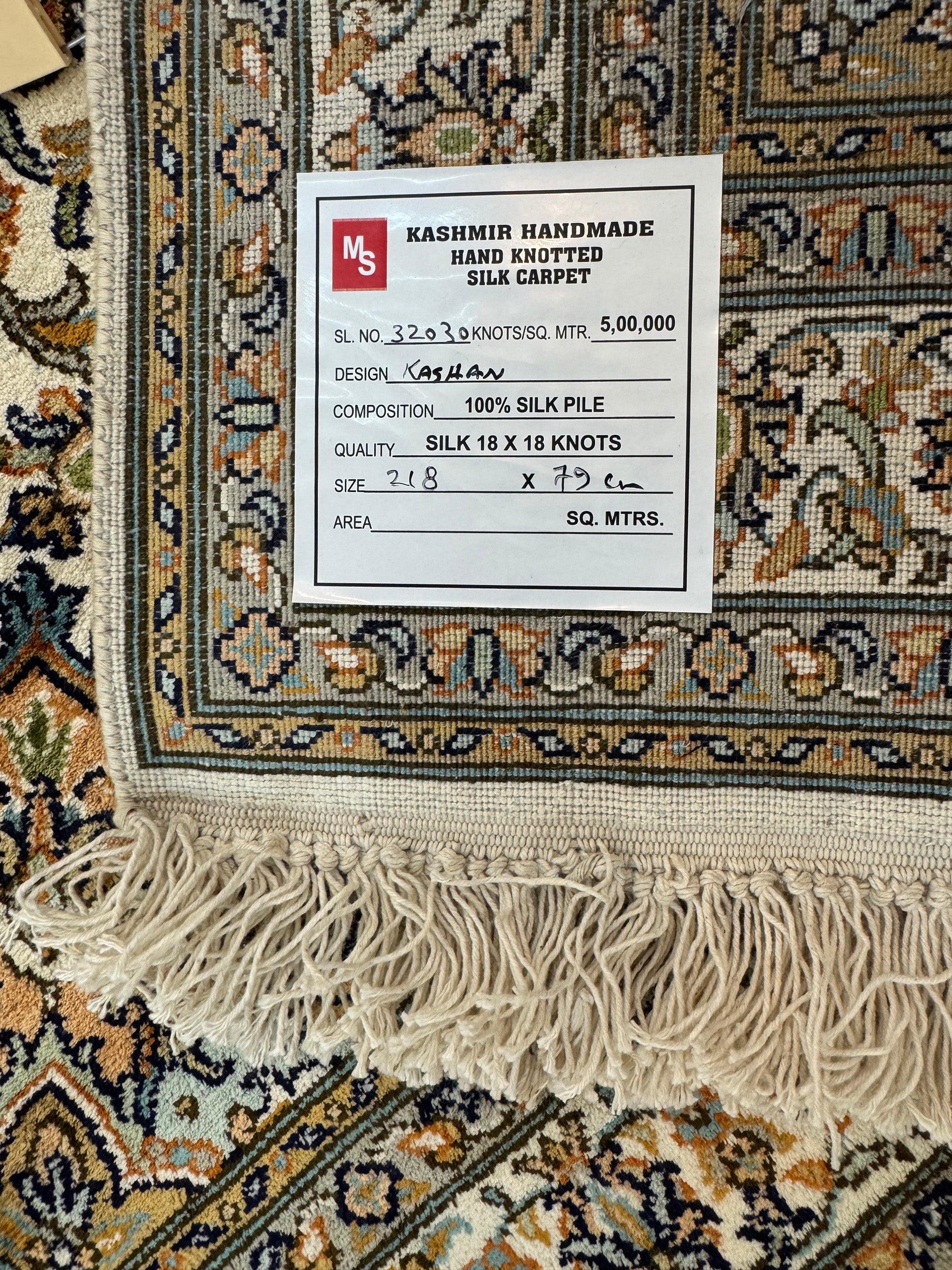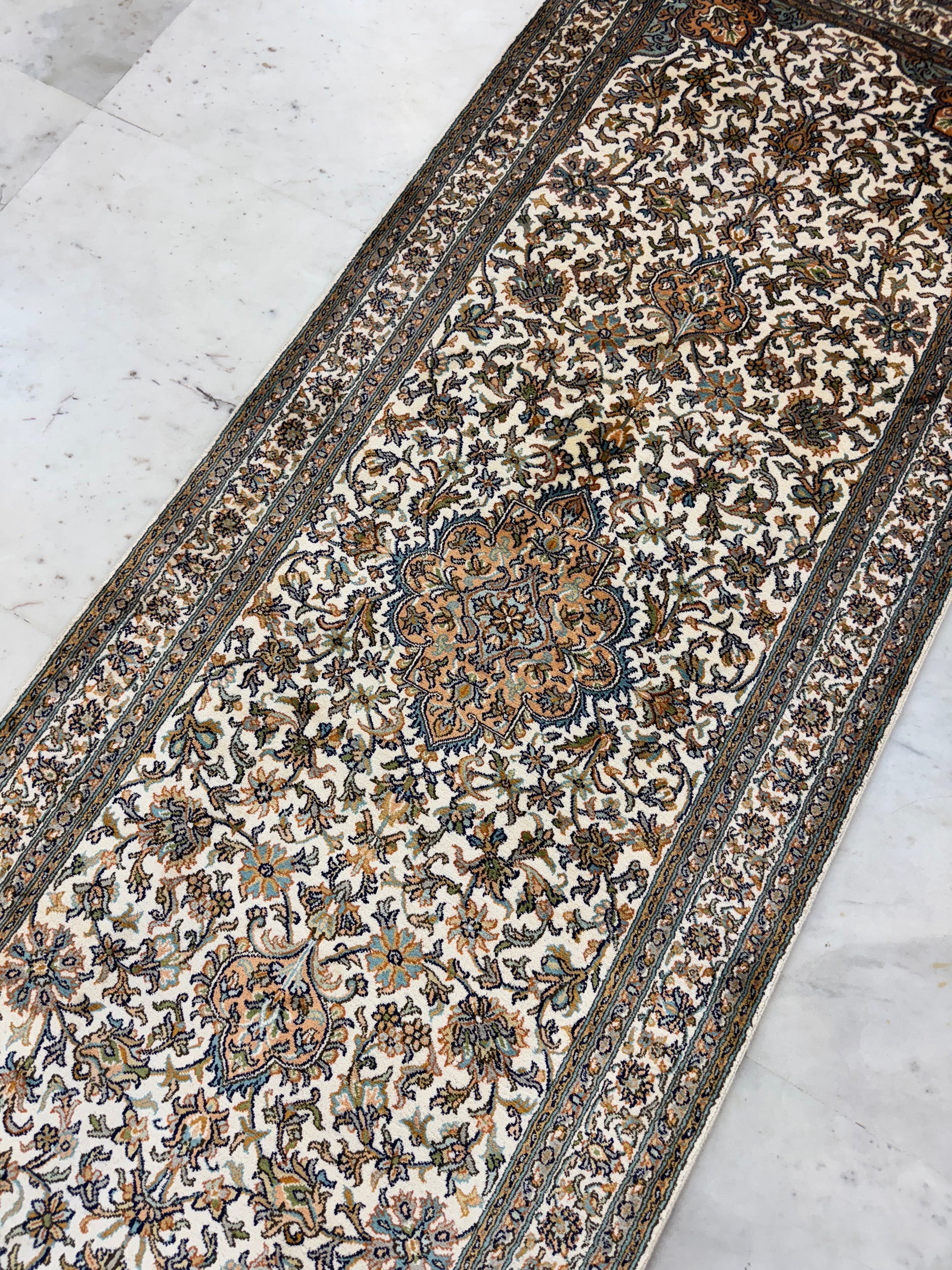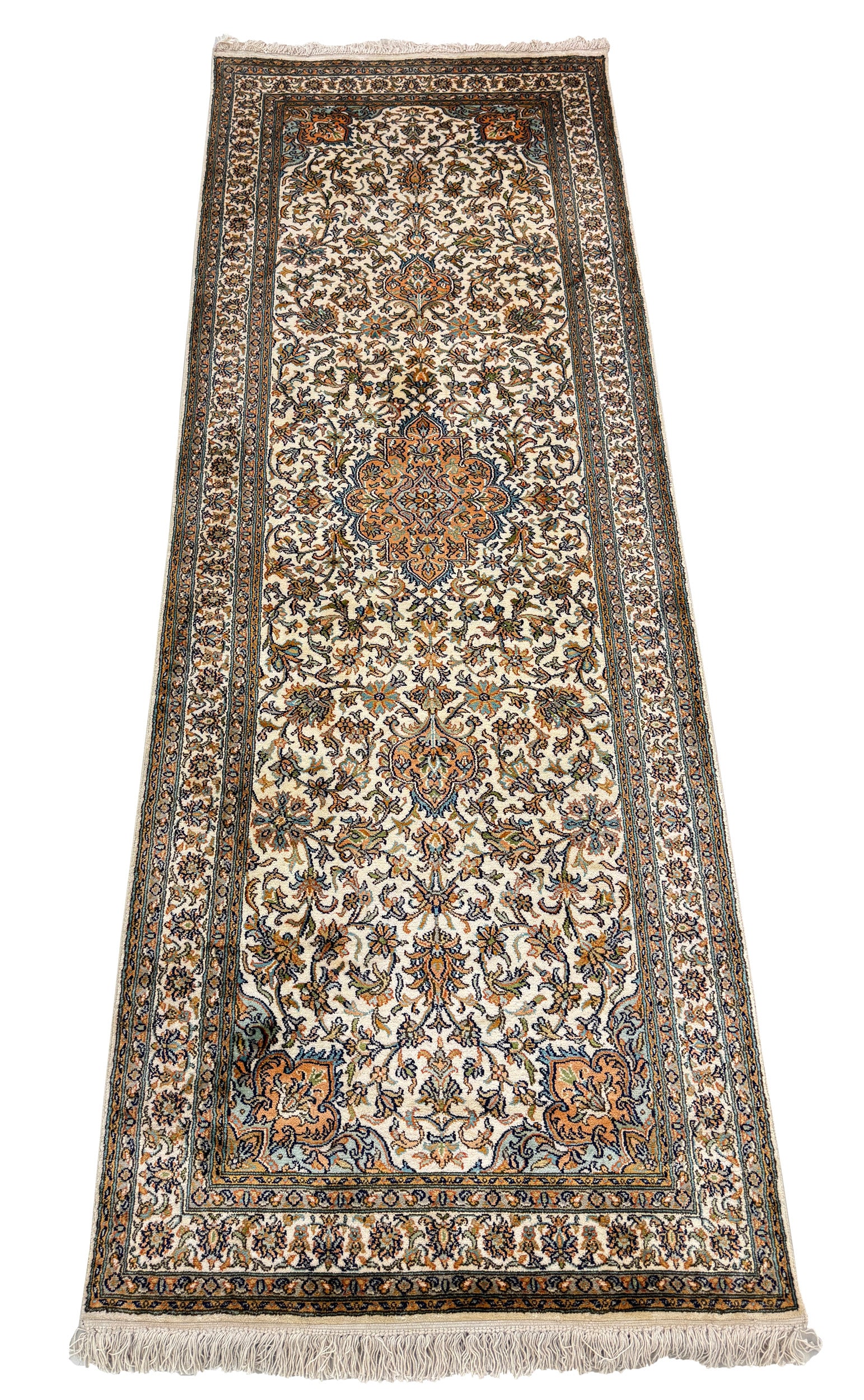Hand knotted Kashmir pure silk pile runner, 218x79cm | Rug# 32030