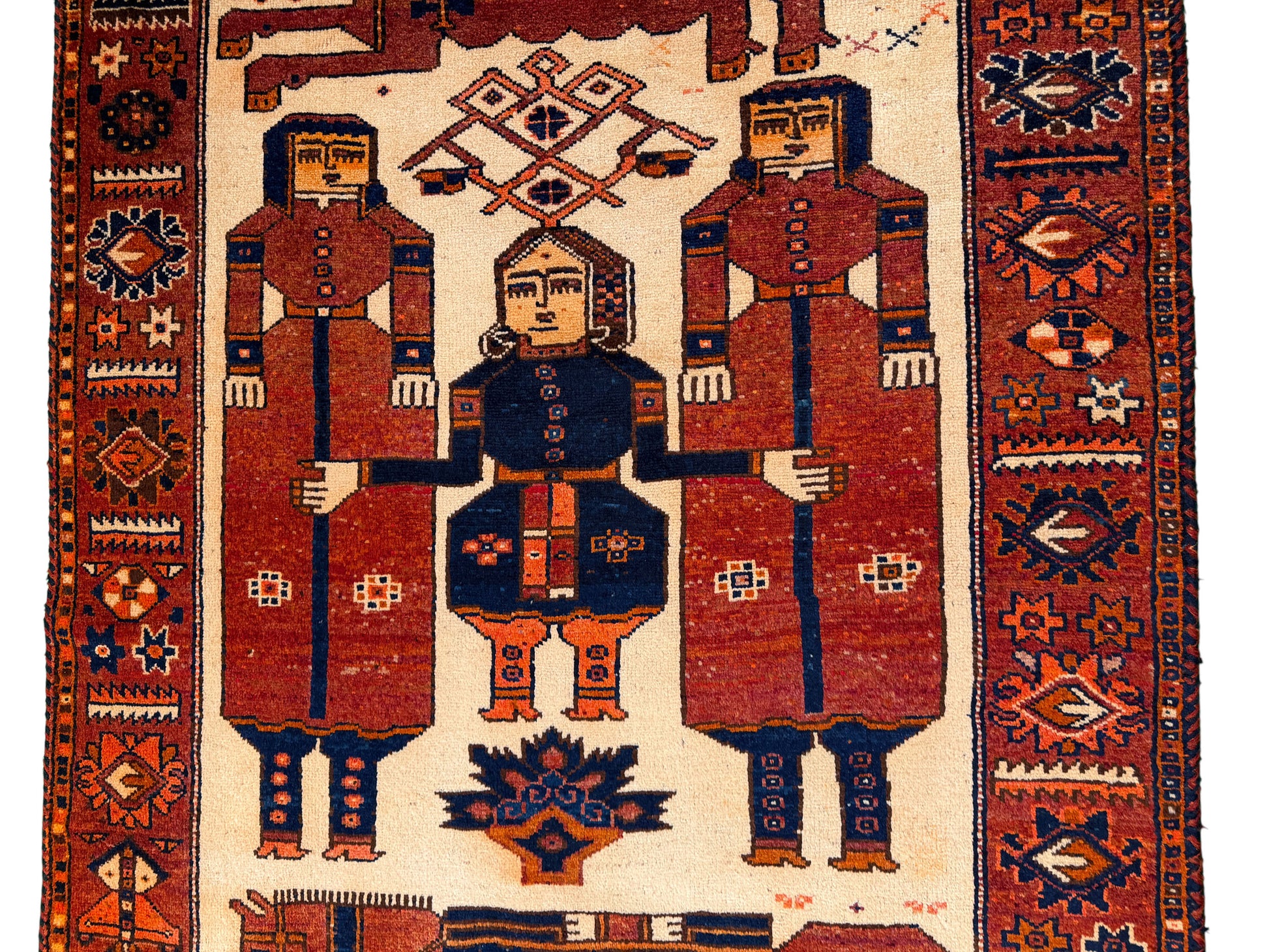 This vintage Luri pictorial rug, woven in Persia circa 1940, depicts a finely executed Shahnameh scene—an emblem of the region’s revered storytelling tradition. Known for their expressive artistry, Luri weavers bring narrative depth to their textiles, and this piece showcases that heritage through its detailed figures, vibrant dyes, and balanced composition. Crafted from hand-spun wool and preserved in immaculate condition, the rug maintains both structural strength and visual brilliance. A distinguished pictorial weaving, it offers cultural richness and decorative impact for collectors and interiors alike.