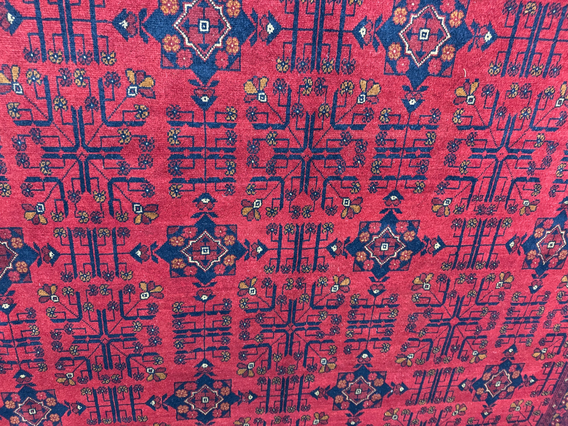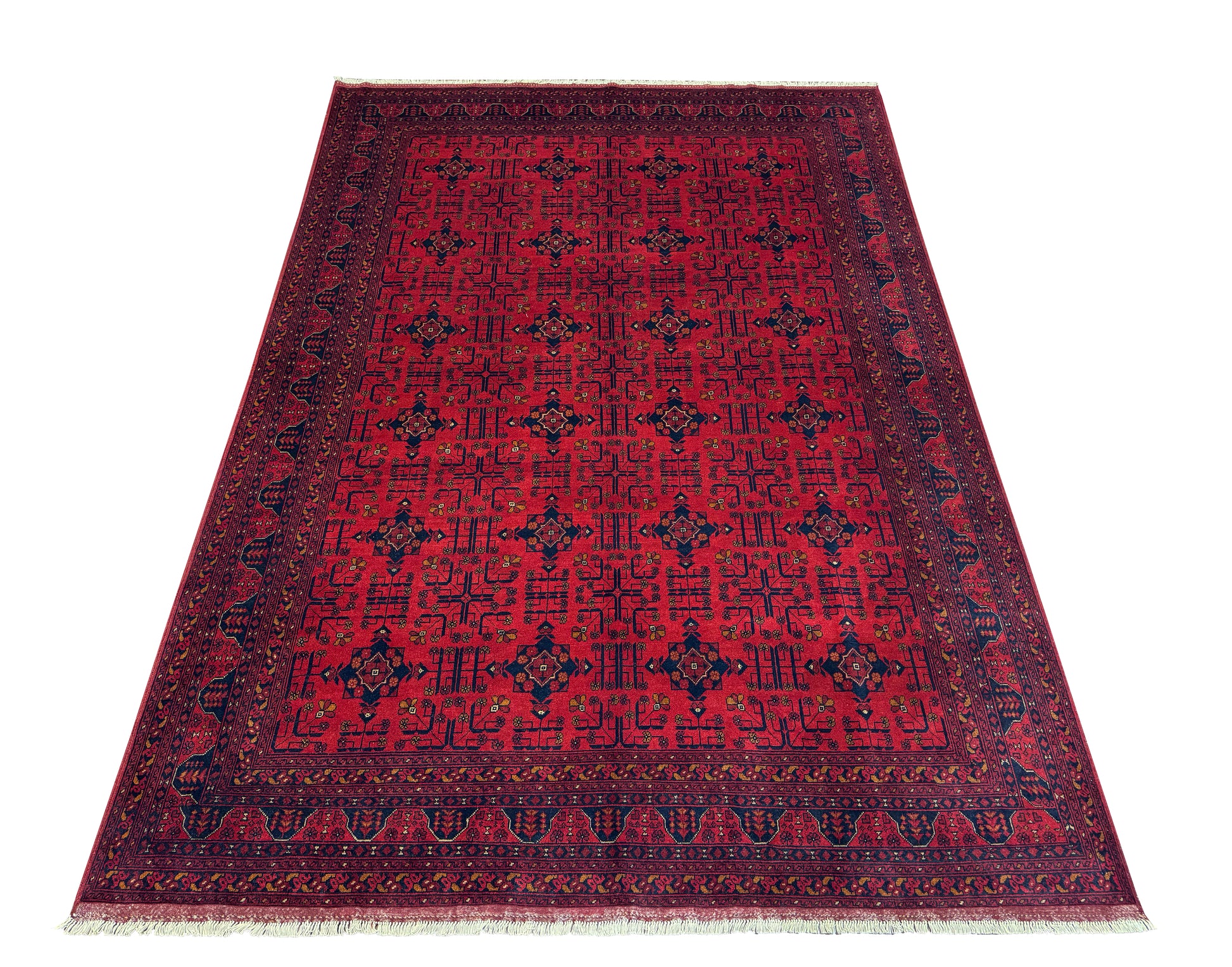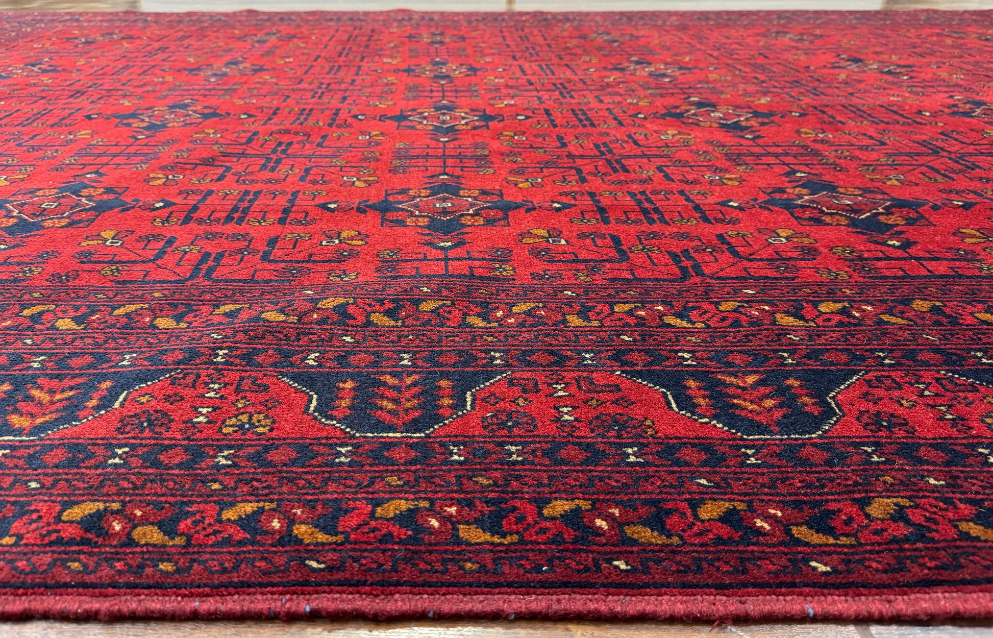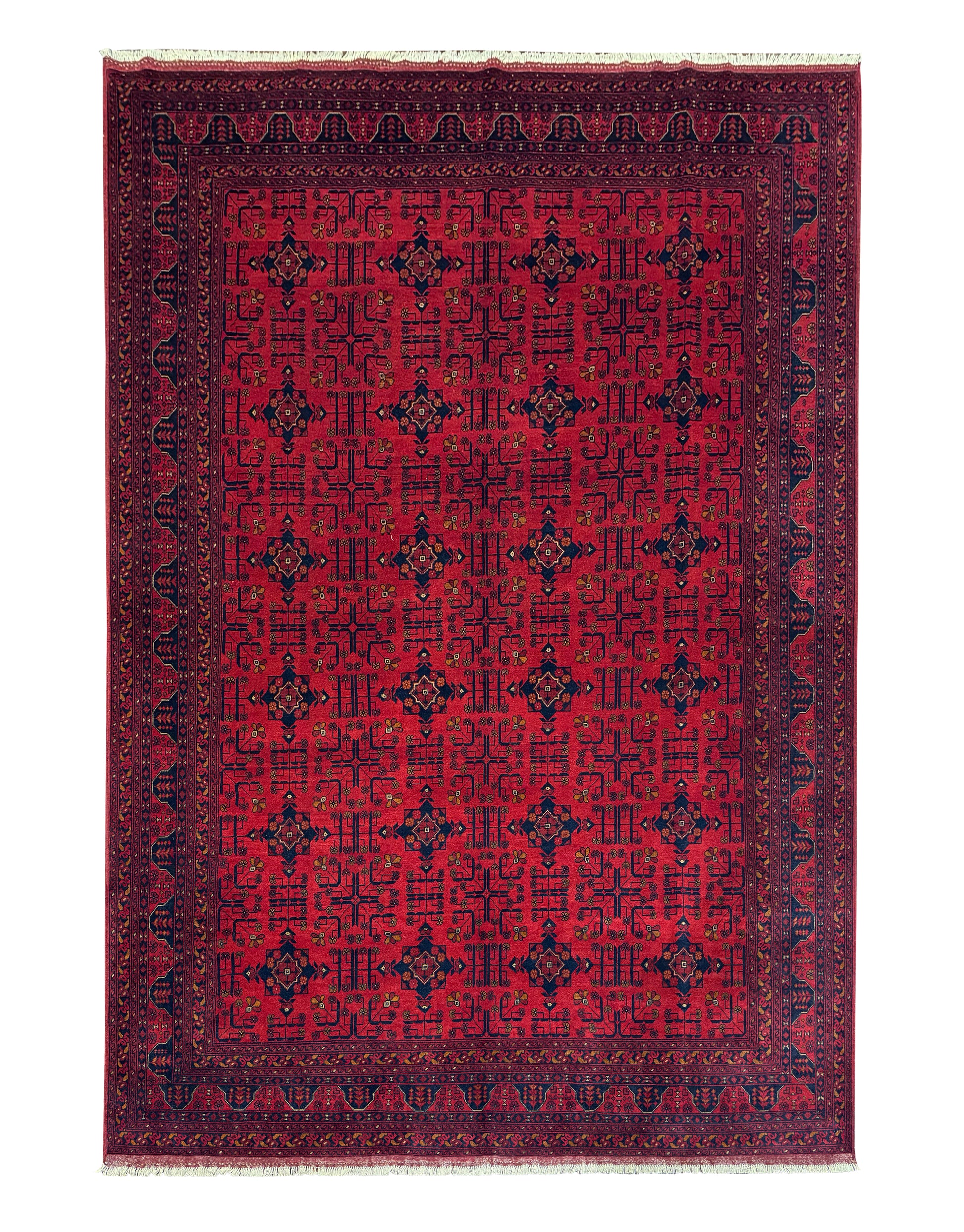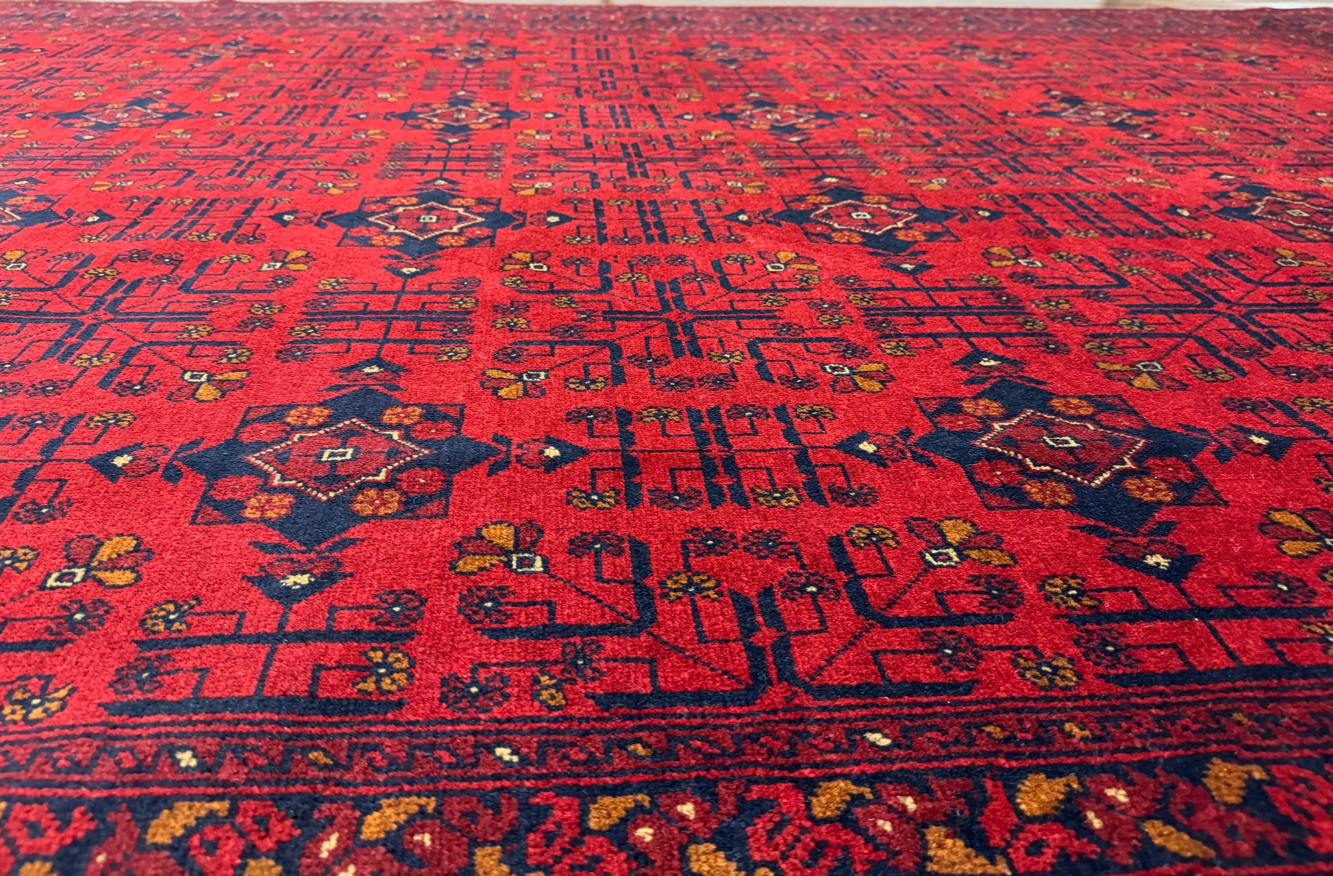 This superfine Kunduz rug is a masterpiece of Ersari Turkaman weaving, distinguished by its fine wool pile and exceptional knot density of around 300,000 knots per square metre. The all-over Ersari gul design, deeply rooted in tribal tradition, creates a bold yet harmonious pattern across the field. Renowned for strength and durability, this piece is both a practical floor covering and a collector’s item, blending Afghan authenticity with timeless craftsmanship.