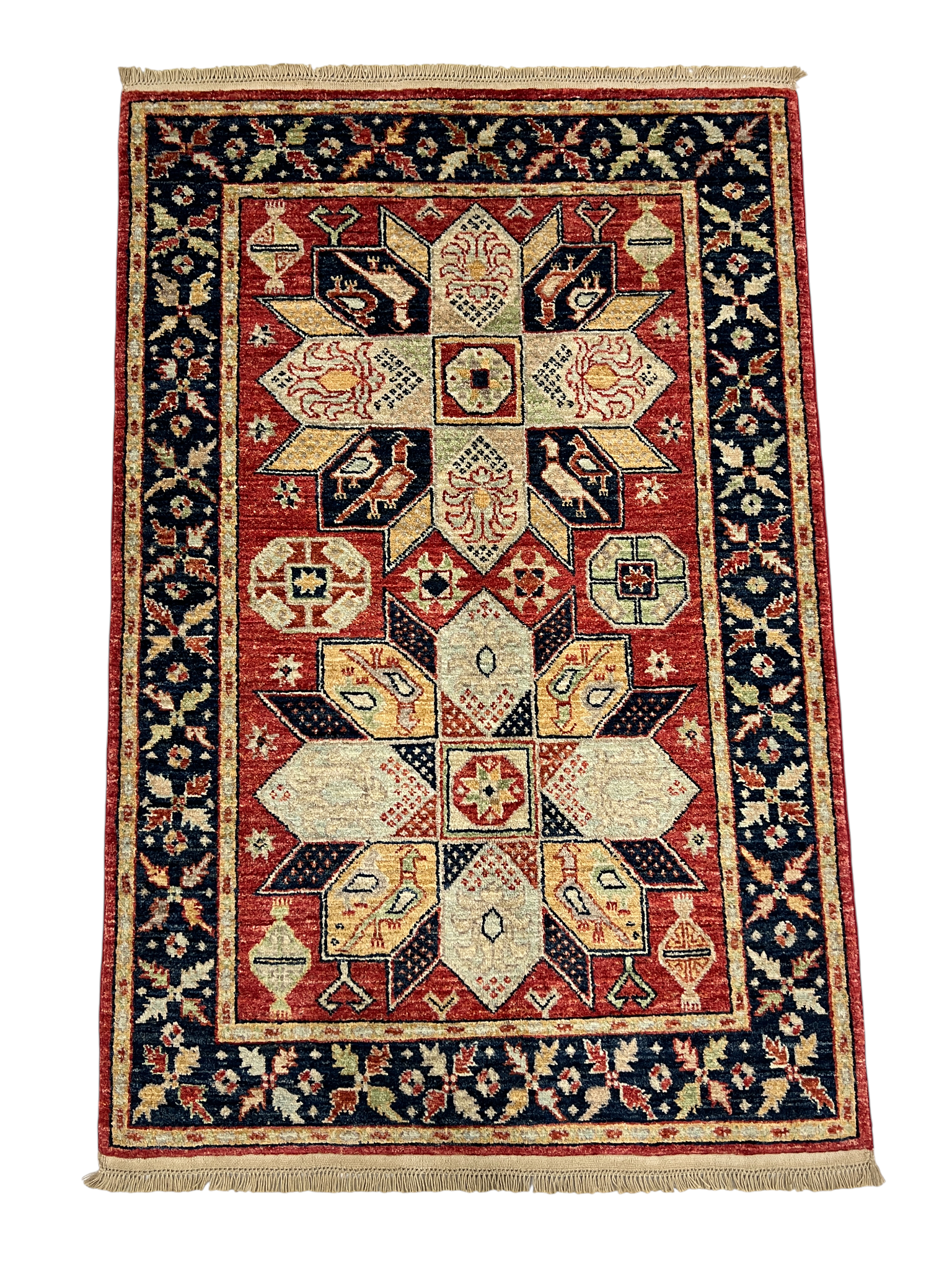 Hand knotted Afghan rug woven by Turkmen artisans in 19th century Caucasian Lotus design, handspun wool pile and natural vegetable dyes,
